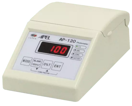 Фотоколориметр Ареl АР-120 - модернізований аналог фотоколориметра Apel AP-101, являє собою оптичний прилад для вимірювання концентрації речовин в розчинах. Дія колориметра заснована на властивості забарвлених розчинів поглинати світло, що проходить через них, тим сильніше, чим вище в них концентрація забарвлюючої речовини. Ареl АР-120 - простий в роботі фотоелектричний колориметр загального призначення, керований мікропроцесором. Дозволяє отримати надійні та точні результати при проведенні досліджень в різних областях ветеринарії та медицини.
