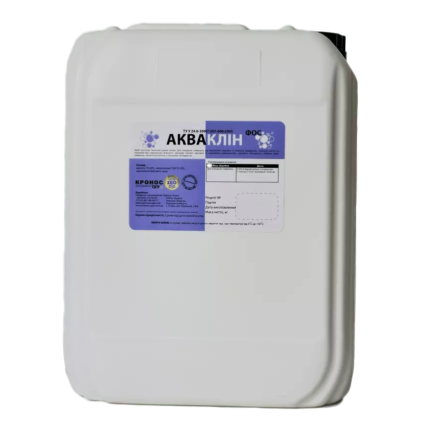 Акваклін ФОС — це кислотний пінний очищувальний засіб на основі ортофосфорної кислоти, призначений для видалення неорганічних забруднень у харчовій промисловості та сільському господарстві. Забезпечує глибоке очищення поверхонь після лужного миття, особливо ефективний для підлоги, стін та обладнання, що контактує з харчовими продуктами.